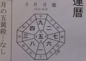5月5日~6月5日までが暦法での5月となります。五黄土星が中宮ですので五黄殺・暗剣殺はありません。ただし西北の方位は月破となり、注意が必要です(写真・北が下となり、一般の地図とは逆になります)。