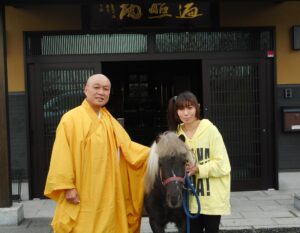 あさか大師に隣接する特別養護老人ホーム「花水木はなみずきの里」に、イングランドポニーの「はな」ちゃんがいます。散歩の途中、時には〝お参り〟に寄ってニンジンをいただいています(写真・右は担当の今井さん)。