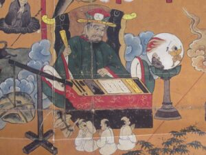 仏教では閻魔大王の〈浄頗梨鏡〉に映し出され、〈業秤〉で罪の重さを見極めるという設定で教示しています(写真)。誰が裁くのではありません。自分の魂が自分自身を裁くのです。これによって自分を第三者の眼で見て、生前の善悪を知るのです。エンマ様は自分の心想の中にいると知りましょう。