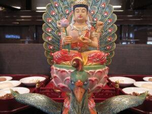 私は毎朝、弘法大師(お大師さま)と光明真言(先祖供養)の行法に励み、午前11時半にはお護摩を修しています。そのほか鎮宅霊符神や八大龍王と共に、孔雀明王への祈りも欠かしません(写真)。この孔雀明王への祈りは、コロナ禍とウクライナ戦争の終息を願って、個人的に始めたものです。