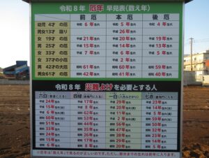 あさか大師では〈令和8年厄年・災難年早見表〉を境内に掲示しました(写真)。ホームページの「厄よけ・災難よけ」にも掲載されています。