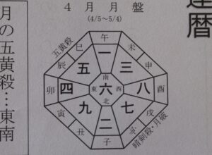 4月5日~5月4日までが、暦法での4月となります。六白金星が中宮で、東南が五黄殺、西北が暗剣殺・月破となりますので、この方位には注意が必要です。(写真・北が下となり、一般の地図とは逆になります)。