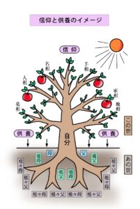 私は先祖供養の説明をする時、相手の方を一本のリンゴの樹にたとえています。下の図を見てください。これで説明すると、よくわかるはずです。