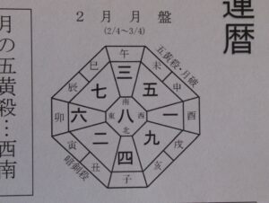 2月4日(立春)~3月4日までが暦法での2月となり、令和8年に変わります。八白土星が中宮で、西南が五黄殺・月破、東北が暗剣殺となりますので、この方位には注意が必要です。(写真・北が下となり、一般の地図とは逆になります)。