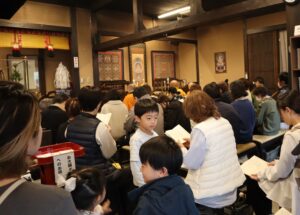 また、午後1時からは春彼岸会法要を勤修し、先祖代々・先亡・水子への供養を勤めました(下写真)。僧侶の声明とご信徒の読経が共鳴し、光明真言の念誦が融合しました。法要の後には「お土砂」の授与やおはぎのご接待があり、彼岸中日の功徳あるひと時を過ごしました。
