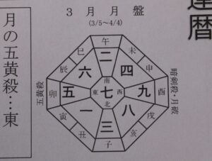 3月5日~4月4日までが暦法での3月となります。七赤金星が中宮で西が暗剣殺・月破、東が暗剣殺となりますので、この方位には注意が必要です(写真・北が下となり、一般の地図とは逆になります)。