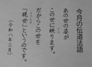 3月の伝道法語を境内に掲示しています。春のお彼岸にちなんで、この世とあの世の関係です(写真)。