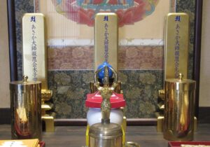 私は毎朝、お大師様そのものである大日如来に向かって光明真言法を修し、先祖供養のお勤めをしています。このご本尊様と共に、もうひとつ大事なのがお位牌です(写真)。このお位牌が、あさか大師の先祖供養に参加する皆様の供養紙(お札)とつながり、私の祈りと融合します。お位牌は先祖代々(直系)・先亡(傍系)・水子の三体があり、常に香華・灯明・飯食・茶菓が供えられています。