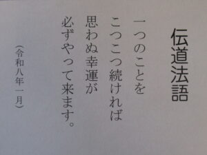 新年1月の伝道法語です(写真)。境内の伝道板に掲示して、参詣の皆様に読んでいただいています。
