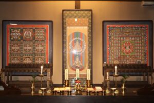 あさか大師では毎日、真言密教の光明真言法を修し、全国の弟子僧がこれを助法し、さらに、お護摩の中でも滅罪生善を祈念します。そして、月に三度の総回向をなし、僧侶とご信徒が共に回向殿(写真)で読経しています。