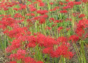 ところが今や群生地は人気の的で、たくさんの人々が集まります。特に本県・日高市の〈巾着田〉は〈曼珠沙華まつり〉が催され、約30万人が訪れます。たしかに、秋の野山に咲きほこる真っ赤な花は美しく、元気を与えられ、お彼岸にもふさわしい姿です。