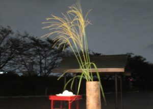そこで、あの世の月に供える意味で、ススキとお団子(弟子僧の手作り)を飾りました(写真)。ススキの右上あたりに、あの世の月があるかも知れません。花器は平安時代の瓦製経筒で、写経を埋葬した容器です。