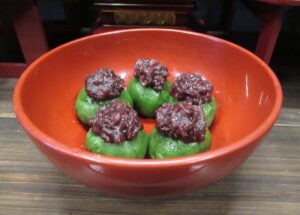 あさか大師の近辺には、まだまだヨモギが自生しています。毎年この時期には、弟子僧がヨモギ餅を作ってお大師さまに奉供していますが、今年は私が作りました。先日、眼科手術を受け、順調に快癒していますので、その御礼の意味で奉供したのです。初めての経験で、団子とも餅ともいえず、形も不揃いですが、手作りの香りは豊かです(写真)